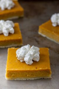 - To make filling: drain tofu and place in a food processor and process until smooth. Add remaining filling ingredients.Process until well blended. Pour into the crust and bake for about an hour or until a toothpick inserted comes out clean. Remove from the oven and chill until firm. Cut into 2 ½ “ squares and top with whipped topping (we love TruWhip or Coconut Whip) and add a dusting of cinnamon.
