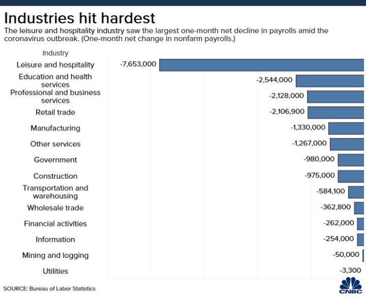 The industry was the hardest hit, losing more than 7.6 million jobs, or 47 percent of total positions.