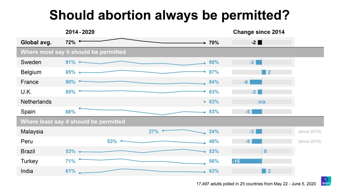 Ipsos has been tracking global views on abortions for the past six years and in this year’s poll of nearly 17,500 people from 25 countries – 70% on average said abortion should be permitted – a high majority result. But support is down from 75% in 2016 and just 2% lower than when the poll began in 2014.