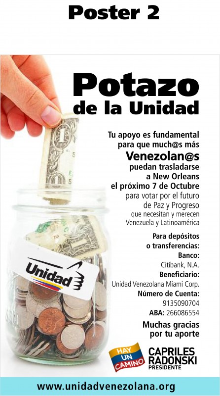 La Mesa de la Unidad Democrática, MUD de Miami, iniciara una campaña este misma semana de recolección de fondos, dentro de la comunidad hispana del sur de Florida, a través del “Potazo de la Unidad” con miras, al tener éxito este operativo, poder alquilar más autobuses y transporte aéreo, para ayudar a mas de 1500 venezolanos que no tienen recursos disponibles y que ya están debidamente encuestados, para que viajen a votar en las elecciones presidenciales a celebrarse en la ciudad de New Orleans el domingo 7 de octubre.