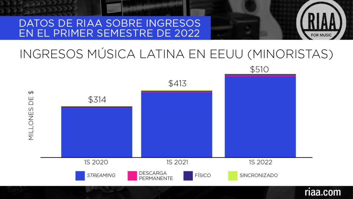 “Los ingresos de la música latina en Estados Unidos aumentaron a más de $500 millones de dólares en el primer semestre de 2022″, agregó Josh Friedlander, vicepresidente de investigación y economía de RIAA. “Nuevamente, streaming sigue siendo el rey en el segmento latino de Estados Unidos y genera un asombroso 97% de los ingresos totales. Las dos principales categorías de streaming, suscripciones pagadas y streaming a pedido con publicidad, además de CD y el revitalizado formato de discos de vinilo, tuvieron aumentos en la música latina durante este periodo”.