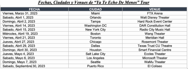 Los conciertos se presentarán en Miami, Orlando, Tampa, Washington DC, New York, Boston, Toronto, Chicago, Dallas, Houston, Salt Lake City, Los Ángeles, Seattle y Puerto Rico. Boletos estarán en pre-venta el miércoles, 9 de noviembre desde las 10 AM y a partir del 11 de noviembre a las 10 AM estará a la venta al público en general por medio del sitio web www.ricardomontaner.com.