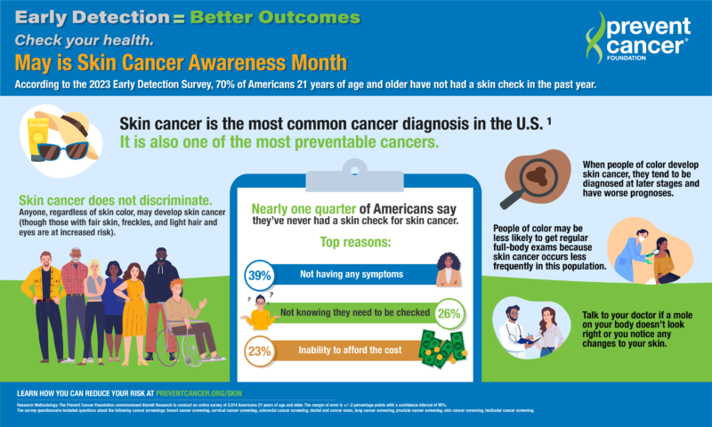 May is Skin Cancer Awareness Month, but according to a recent survey from the Prevent Cancer Foundation, 70% of Americans 21 years of age and older have not had a skin check in the past year. Survey participants’ most cited reasons for not being checked were not experiencing symptoms (29%), not knowing they need to be checked (26%) and inability to afford the cost (23%).