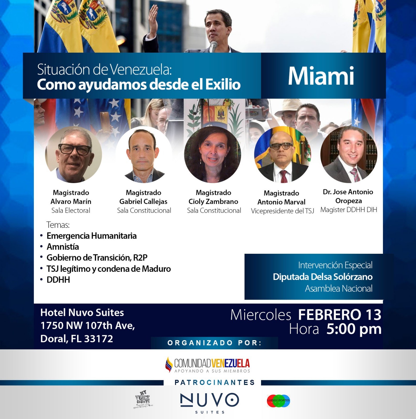 Comunidad Venezuela informa la realización de la rueda de prensa, que se llevará a cabo el miércoles, 13 de febrero de 2019; Hora: 5:00 pm a 7:30 pm en: Hotel Nuvo Suites: 1750 NW 107th Ave, Doral, FL 33172. El objetivo de este evento es dar a conocer, a través de expertos, la situación actual de Venezuela: el mandato a la Ejecución de La Emergencia Humanitaria; amnistía, R2P y cómo podemos ayudar a nuestros connacionales, desde el exilio. Como invitados y panelistas, tendremos al Magistrado Alvaro Marin; Sala Electoral, Magistrado Cioly Zambrano, Sala Constitucional; Magistrado Gabriel Callejas, Sala Constitucional; Magistrado Antonio Marval, vicepresidente del TSJ; Dr. Jose Antonio Oropeza, Magister en DDHH; con la intervención especial por la Asamblea Nacional la Diputada Elsa Solórzano, encargada de la Comisión de Amnistía. Los temas que se tratarán están vinculados con la actual situación de Venezuela, que componen: La emergencia humanitaria, la Amnistía, designación de Juan Guaidó como Presidente Encargado de Venezuela, Gobierno de Transición, el TSJ Legítimo; el encarcelamiento de Maduro y Derechos Humanos. Agradeciendo la atención que se sirva prestar a nuestra solicitud, quedamos de Usted, Atentamente, My Voice Counts, Inc DBA Comunidad Venezuela Lic. Mildred Rodríguez (M.B.A.) Presidente (407) 683-6607 venezuela@canalhumanitariovenezuela.org Karina Colomina 305.986.7108 karina@karinacolominapr.com