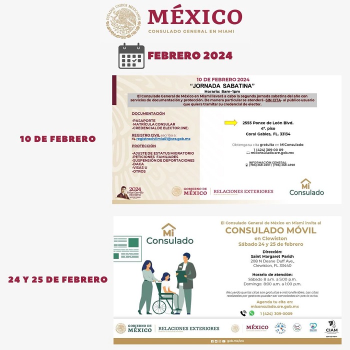 Como parte de las acciones de documentación, asistencia consular y protección preventiva que brinda la Red Consular de México en el mundo, el Consulado General de México en Miami tendrá la segunda “Jornada Sabatina” el próximo 10 de febrero, de 8am a 1pm, en la sede consular (2555 Ponce de León Blvd., 4º. Piso; Coral Gables, FL: 33134). Cabe destacar que para el trámite de credencial de elector no se requiere cita.